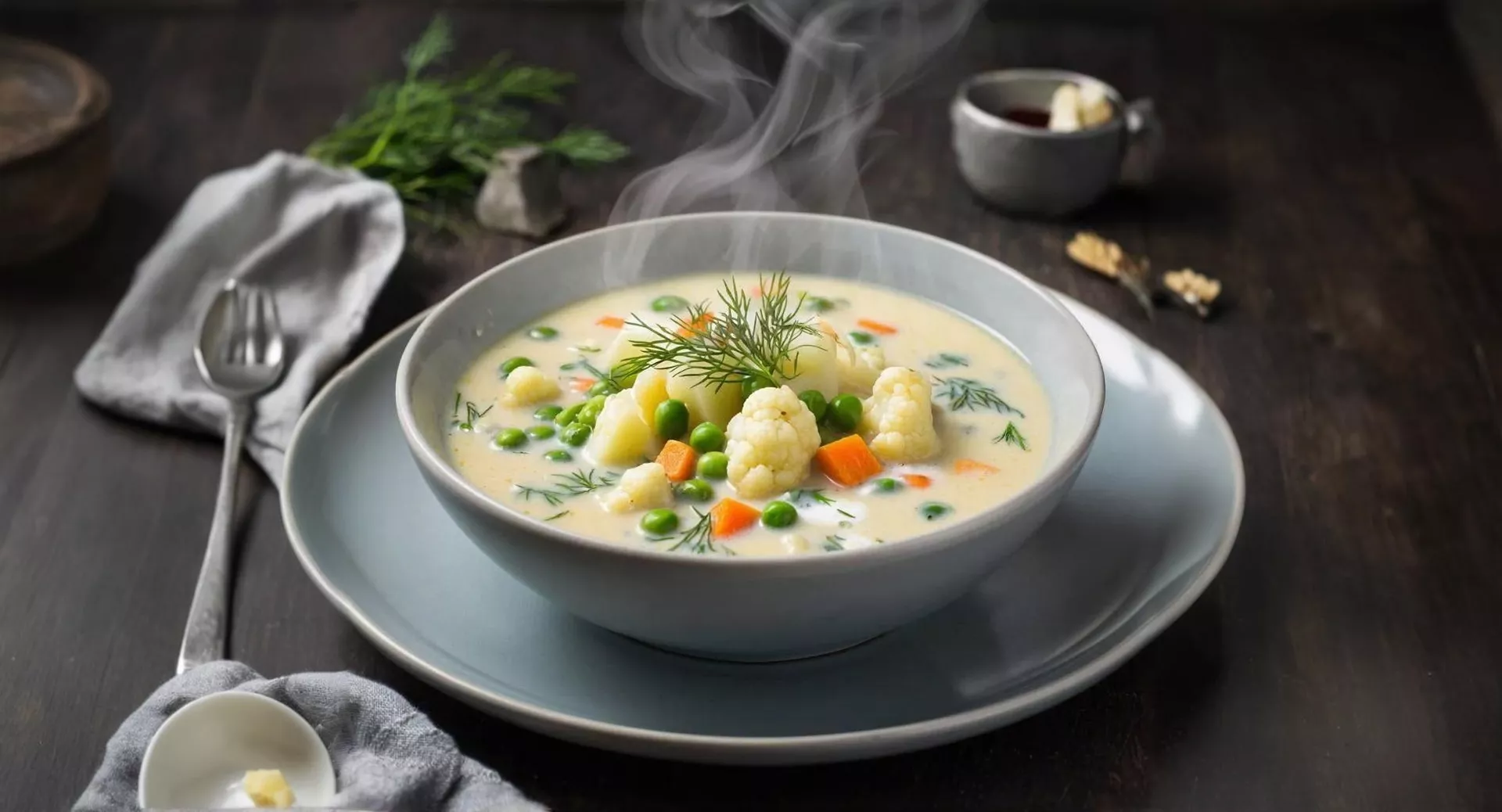 Инструкция. Картофель, морковь очистите и нарежьте кубиками, цветную капусту разберите на соцветия. Морковь обжарьте 2-3 минуты на растительном масле. Влейте в кастрюлю бульон, добавьте картофель, морковь и варите после закипания 5 минут. Выложите цветную капусту и варите еще 10 минут, далее — зеленый горошек, которому необходимо покипеть 3 минуты. В завершении добавьте сливки и укроп. Когда суп закипит, выключите огонь, накройте крышкой и оставьте на 2-3 минуты.