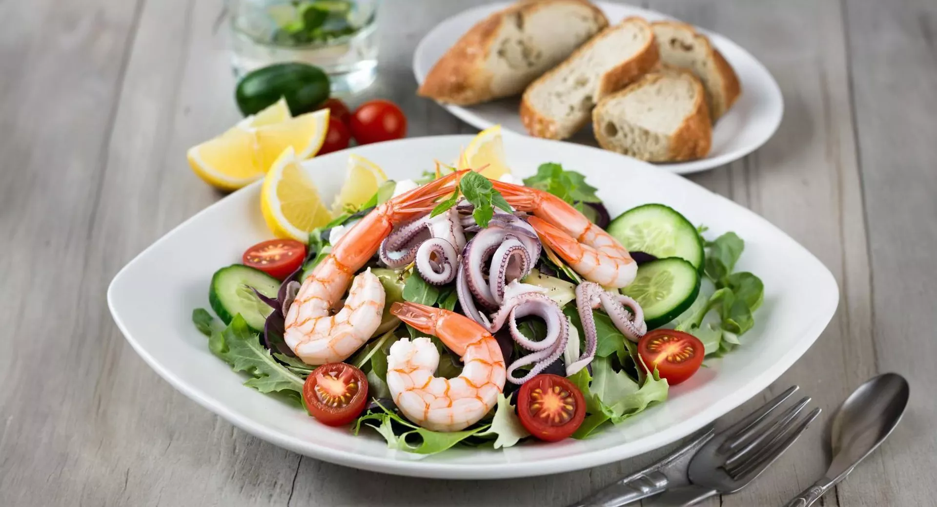 Салат удивительно простой, а соленые огурцы в составе отлично раскрывают вкус морепродуктов.