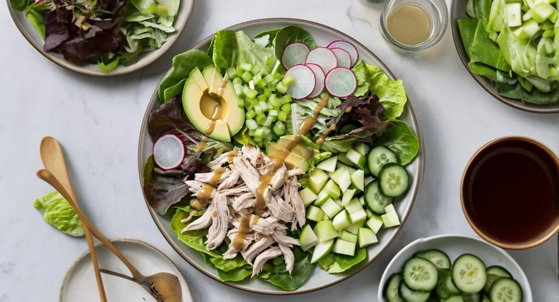 Смешайте 4 ст. л. заправки с ломтиками курицы. Нарежьте сельдерей, яблоко и овощи кубиками, нарвите салат и выложите на сервировочное блюдо. Сверху положите нарезанный авокадо и остаток заправки, затем выложите курицу. Перед подачей натрите сверху немного лимонной цедры и посыпьте салат перцем.