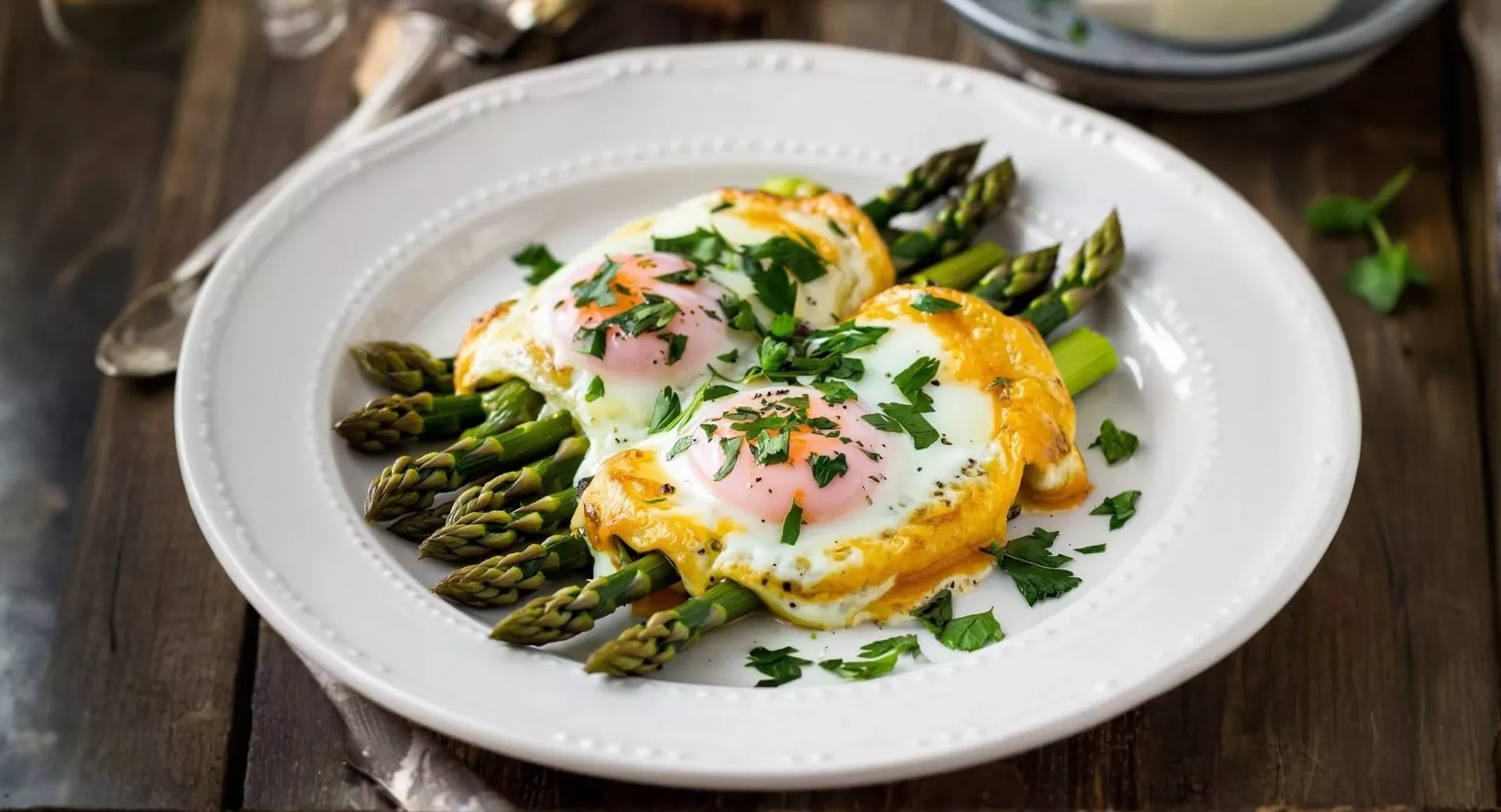 Инструкция. Спаржу нарежьте на кусочки и отварите в кипящей подсоленной воде в течение одной минуты, затем слегка обжарьте на сковороде с топленым маслом. Яйца разбейте в миску, подсолите и залейте спаржу. Поставьте в духовку на 3 минуты, чтобы яйца запеклись. Перед подачей посыпьте блюдо петрушкой.