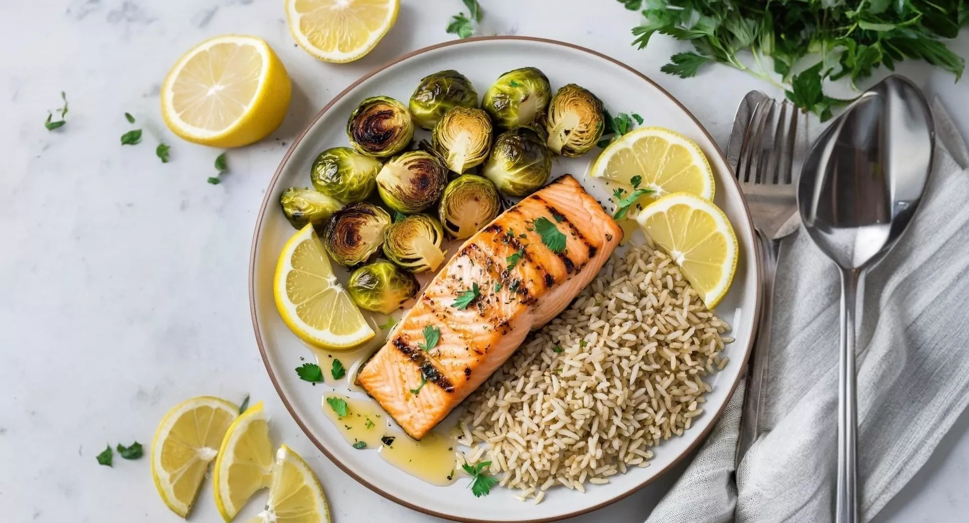 Инструкция. Брюссельскую капусту сбрызните оливковым маслом и запекайте при температуре 220 градусов до легкого подрумянивания (15–20 минут). Смажьте лосось оливковым маслом, полейте лимонным соком и со всех сторон посолите. Запекайте при температуре 220 градусов примерно 4–6 минут. Рис отварите до полной готовности.